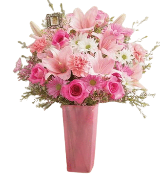 Embrace elegance with our 12pcs Pink Roses and Pink Lily bouquet in a vase. Delicate pink roses symbolize grace and admiration, complemented by the exotic beauty of pink lilies. Perfect for celebrating special moments or adding a touch of sophistication to any space. Ideal as a thoughtful gift or a charming centerpiece that radiates beauty and joy.