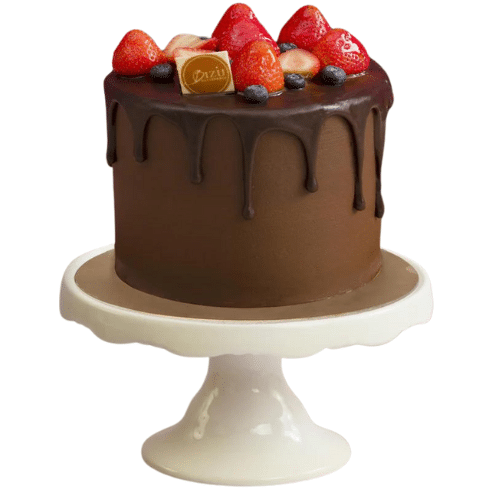 Layers of moist chocolate cake, caramel, chocolate ganache and almond nuts. Topped with fresh strawberries and blueberries.
