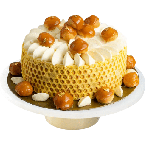 Layers of white chocolate mousse cake with honey-truffle oil, creme brulee and topped with crunchy pearls and soft profiteroles.