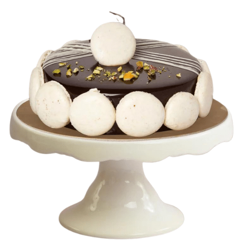 A blend of caramel chocolate mousse and pistachio cream on a bed of crisp chocolate crunch and chocolate cake covered with our homemade chocolate brilliant sauce.