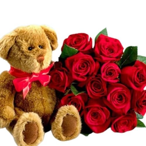 These  1 dozen medium stem red roses are accented with greens and arrive with this adorable 12″ seated bear. They arrive wrapped with greens and ready for the recipient to arrange in their own special way. A soft and huggable small bear, adding a touch of whimsy and charm.