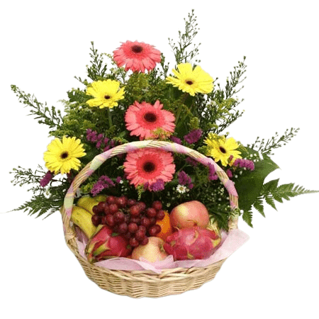 Brighten someone’s day with a stunning combination of nature’s beauty and bountiful goodness. Our exquisite Mixed-Coloured Gerberas and Basketful of Fruits offer a delightful blend of vibrant hues and fresh flavors, perfect for any occasion.(the fruits may vary with the seasons and availability.)