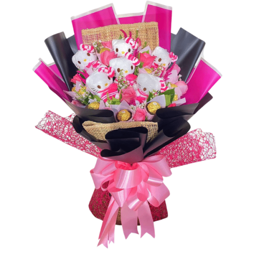 Layer Bouquet of 6pcs. Mini Hello Kitties, 12 Ferrero Rocher Chocolates and 10 Stems Pink Roses with Seasonal Fillers.