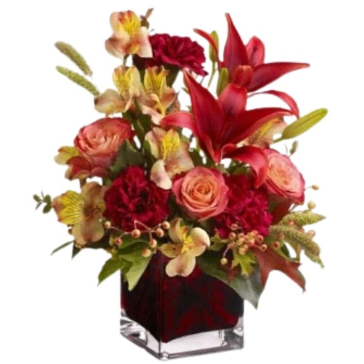 This deep red, orange and burgundy bouquet – complemented by autumn-hued oak leaves and feathery millet – Who wouldn’t love to receive such a gift? Orange roses and red Asiatic lilies, burgundy carnations, huckleberry and berries – are arranged in a glass vase. (Vase may vary.)