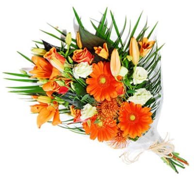 A bright and cheerful mixture including orange gerberas, some remarkable roses, orange lilies and phoenix leaves as a finishing touch.