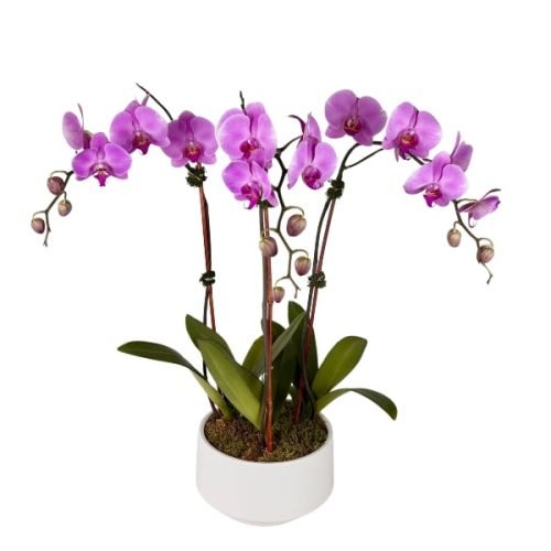 Celebrate any occasion with our beautiful and impressive triple-stemmed purple phalaenopsis orchid garden.
