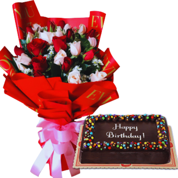 Celebrate love, joy, and cherished moments with our enchanting 12pcs Pink and 12pcs Red Rose with Chocolate Dedication Cake by Red Ribbon. This exquisite offering combines the timeless beauty of pink and red roses with the indulgent taste of our signature Chocolate Dedication Cake, creating a perfect harmony of emotions and flavors.