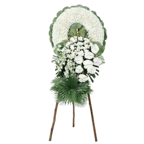 The “Round Condolences Flower” arrangement is crafted to convey heartfelt sympathy and solemn respect. This circular arrangement features a blend of Radus, Anthurium, and Orchids, symbolizing enduring beauty and remembrance