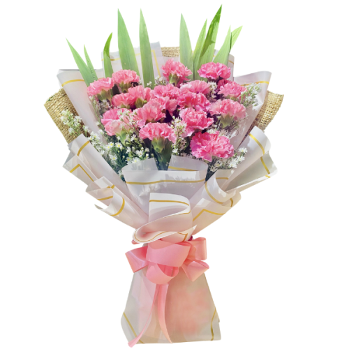 Layer Bouquet of 20 Stems Pink Carnations with seasonal fillers.