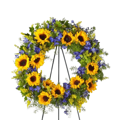 The beautiful sunflowers in our Bright Rays Wreath offers a display of admiration, loyalty and hope. Each bright bloom is complemented by lush greens and blue delphinium blooms. Their uplifting nature reminds loved ones of your support and the brighter days ahead as they navigate through a difficult time.