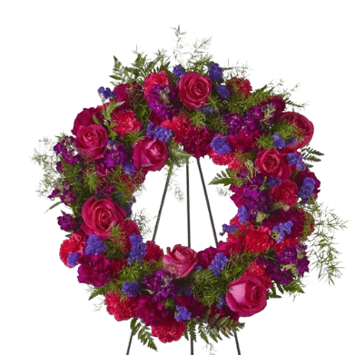 The use of color in a sympathy tribute can evoke emotions that words otherwise can’t. In our Calming Colors Wreath, a gorgeous display of bold pinks and comforting purples come together in a timeless expression of sympathy. This arrangement comes expertly crafted by our designers with stock, roses and carnations to show how much you care.