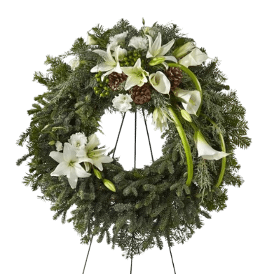 Your thoughts, hope and sentiments are captured in this seasonal wreath. The beauty of the rustic Christmas greens and pinecones bring out the purity of the white calla lilies and lisianthus in our Greens of Hope Wreath.