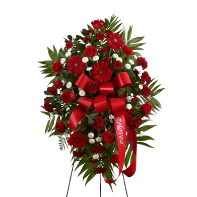 The Treasured Memories Standing Spray is a rich and colorful way to express your unending love and devotion to the departed. An exceptional arrangement of red roses, burgundy carnations, burgundy mini carnations, red gerbera daisies and white button poms are accented with a variety of lush greens. A red ribbon with the word, “Beloved,” embossed in a gold metallic lettering, finishes this beautiful display for their final farewell service.