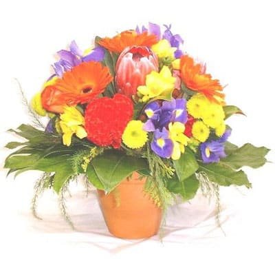 collection of very bright local and exotic flowers with plenty of lush large leaves. This vivid style is a best seller.